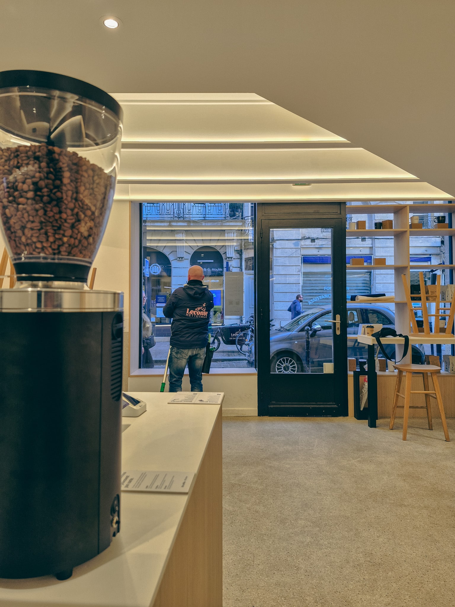 Technicien Leconte Nettoyage en train de nettoyer un sol carrelé à Bordeaux à l’aide d’une machine de nettoyage.